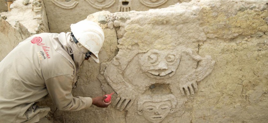 C’est sur le site archéologique de Vichama (Pérou) qu’une fresque murale, composée de visages et d’animaux (serpents, grenouilles), a été découverte.