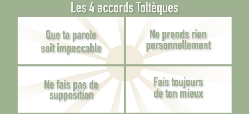 Miguel Ruiz, chamane et auteur mexicain, propose de passer avec soi quatre accords visant à briser nos croyances limitatives. Celles que nous développons depuis l’enfance, qui distordent la réalité et nous maintiennent dans la souffrance. À force de conditionnements culturels et éducatifs et de projections personnelles, nous avons intégré une image fausse de nous-même et du monde.